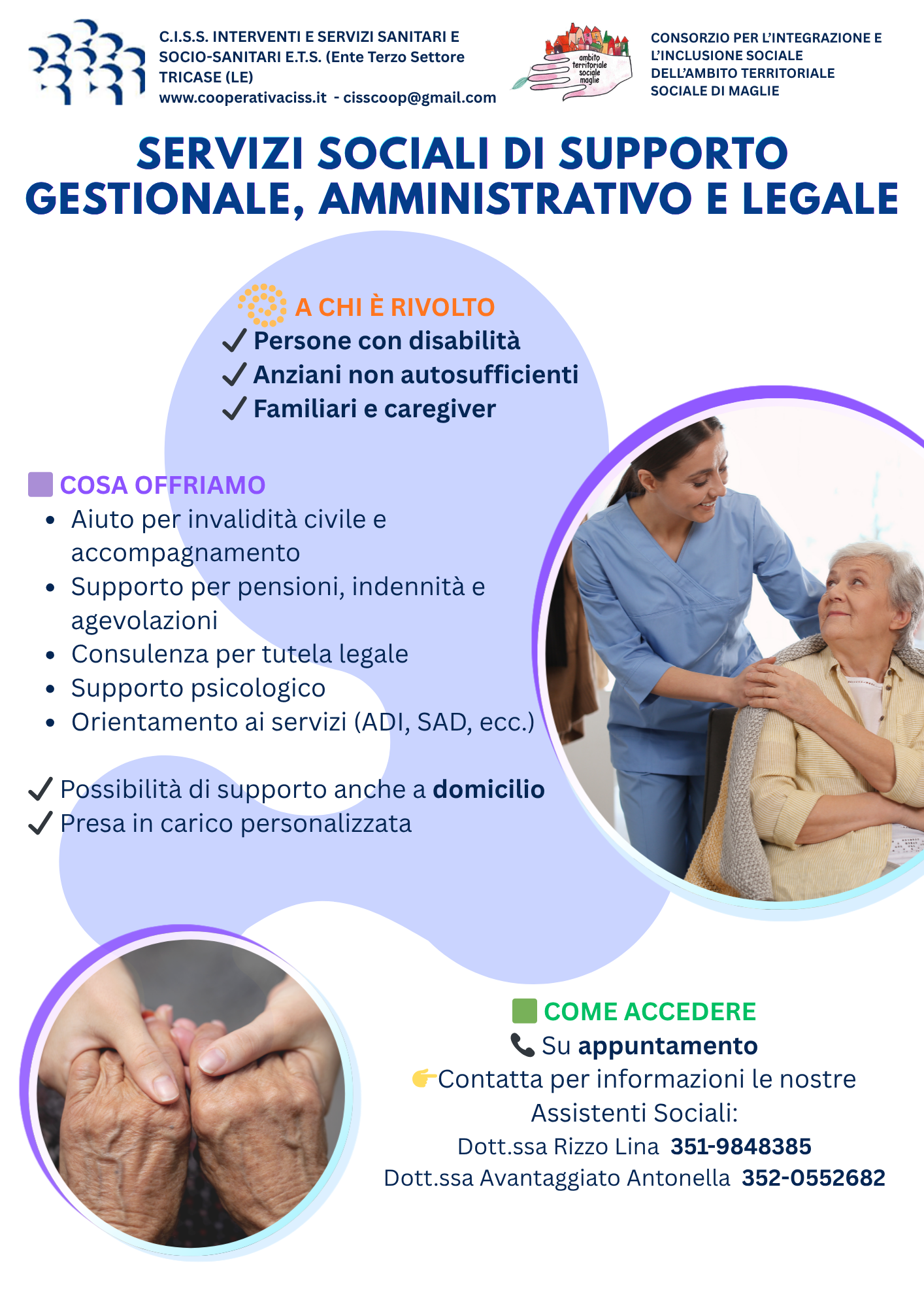 La Cooperativa CISS, in qualità di soggetto affidatario, attiva il Servizio di supporto gestionale, amministrativo e legale in favore di persone con disabilità, anziani non autosufficienti e loro famiglie, in attuazione della normativa nazionale e regionale vigente.